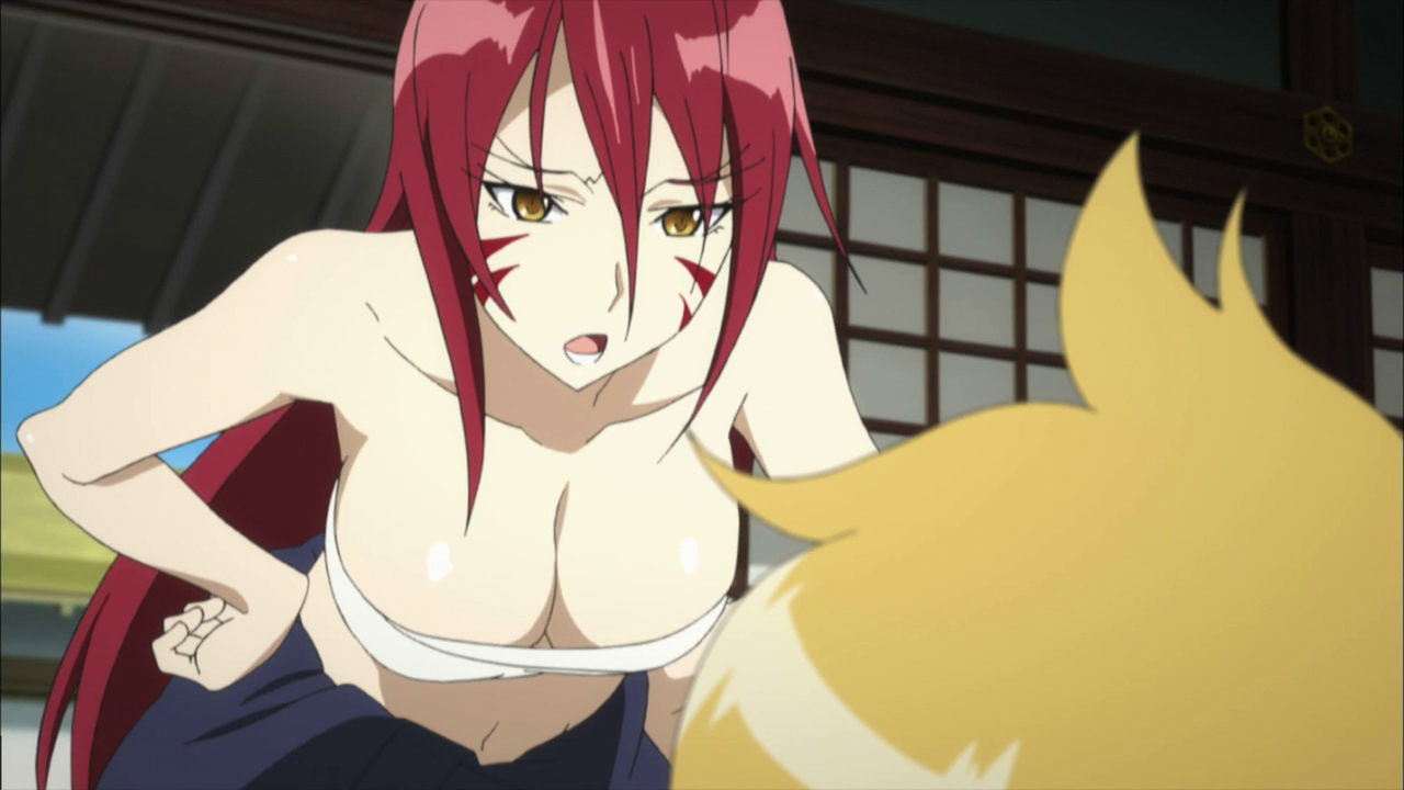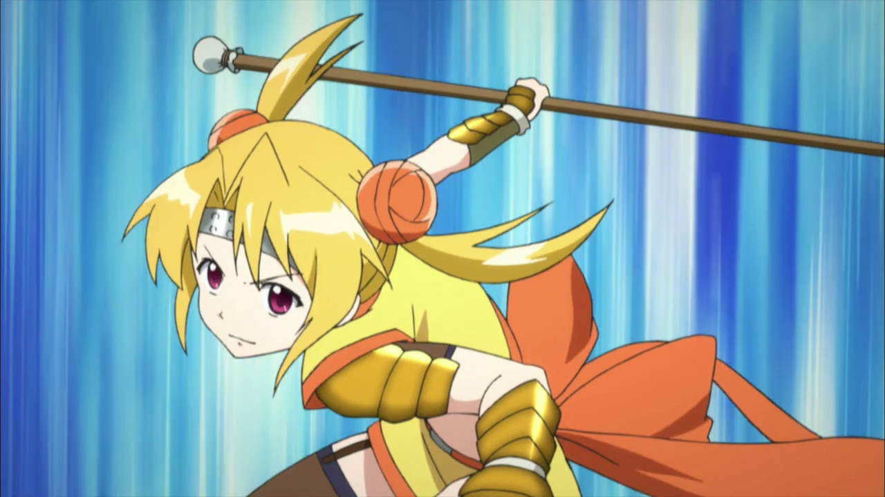The second episode starts off with Hideyoshi coming to the brutal realization that she is indeed trapped in a genderswapped version of Sengoku-era Japan. She manages to quickly adapt, and soon proves her worth to Nobunaga by raising a group of downtrodden villager’s spirits with her cheerful personality. Mitsuhide takes exception to this, however, and tries to embarrass Hideyoshi in a martial contest of skill. Naturally, Hideyoshi clumsily botches things like archery and knife-throwing, only to demonstrate proficiency at fighting with a polearm gained by watching kung-fu shows on television. Impressed, Nobunaga makes Hideyoshi a retainer and orders Mitsuhide to train her in the art of war.