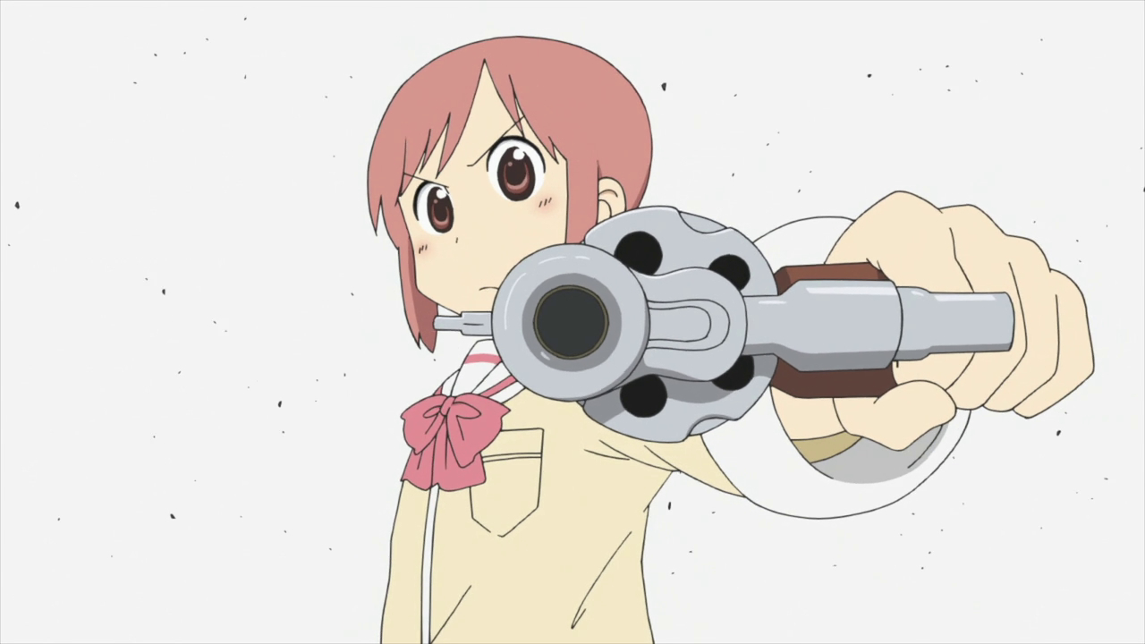 This week on Nichijou: High-speed chase scenes! Parkour! Explosions! Heavy weaponry! Video game consoles from the 1980’s! Malay! Yaoi! Lucha Libre masks! Roll cakes! Sharks! NES passwords! Crayons! Head pastries! Rock paper scissors! Dirty pictures! Squirrel heads! Epic Ribbons! Milky moustaches! Giggling Keima! Tsunderes! Useless teachers! Spiral energy! Chakra gates! Mohawks! And more!